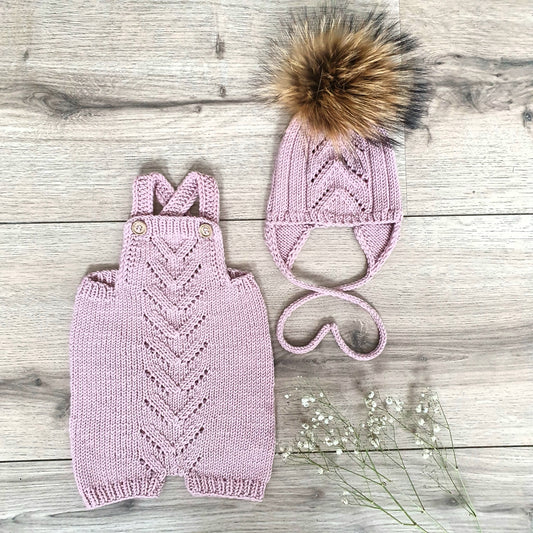 The "VÖK" collection consists of knitting patterns for a women's sweater and a children's jacket with a lace pattern in the back and in the raglan lines, and a hat and dungarees for children and babies with the same lace pattern in the front. Sweater and jacket are knitted as a top-down raglan.