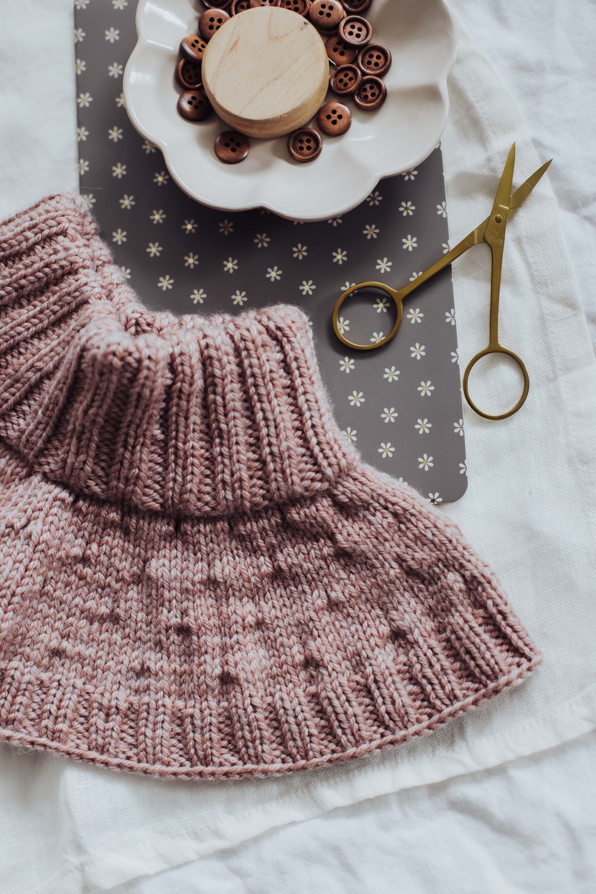 Dieser Kragen wird in Runden von oben nach unten gestrickt. Die Zunahmen in der Rundpasse werden in jeder fünften Runde mit Umschlägen gearbeitet und bilden ein Lochmuster.
