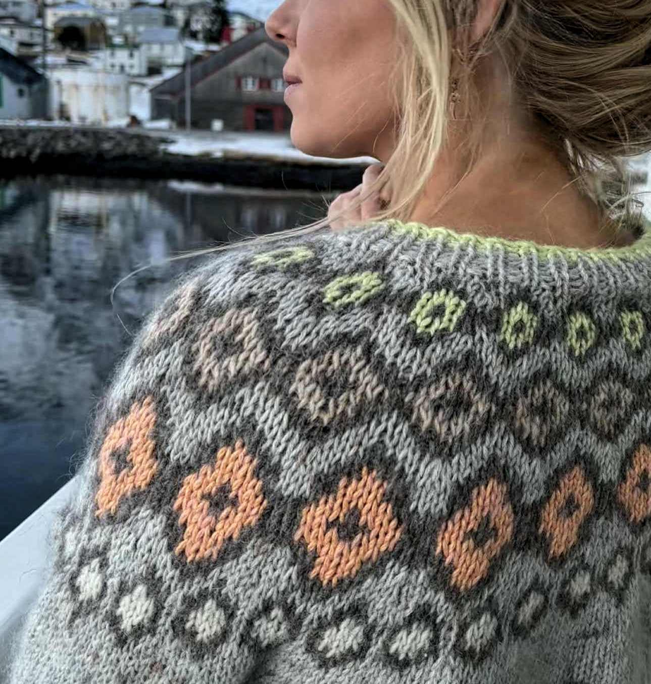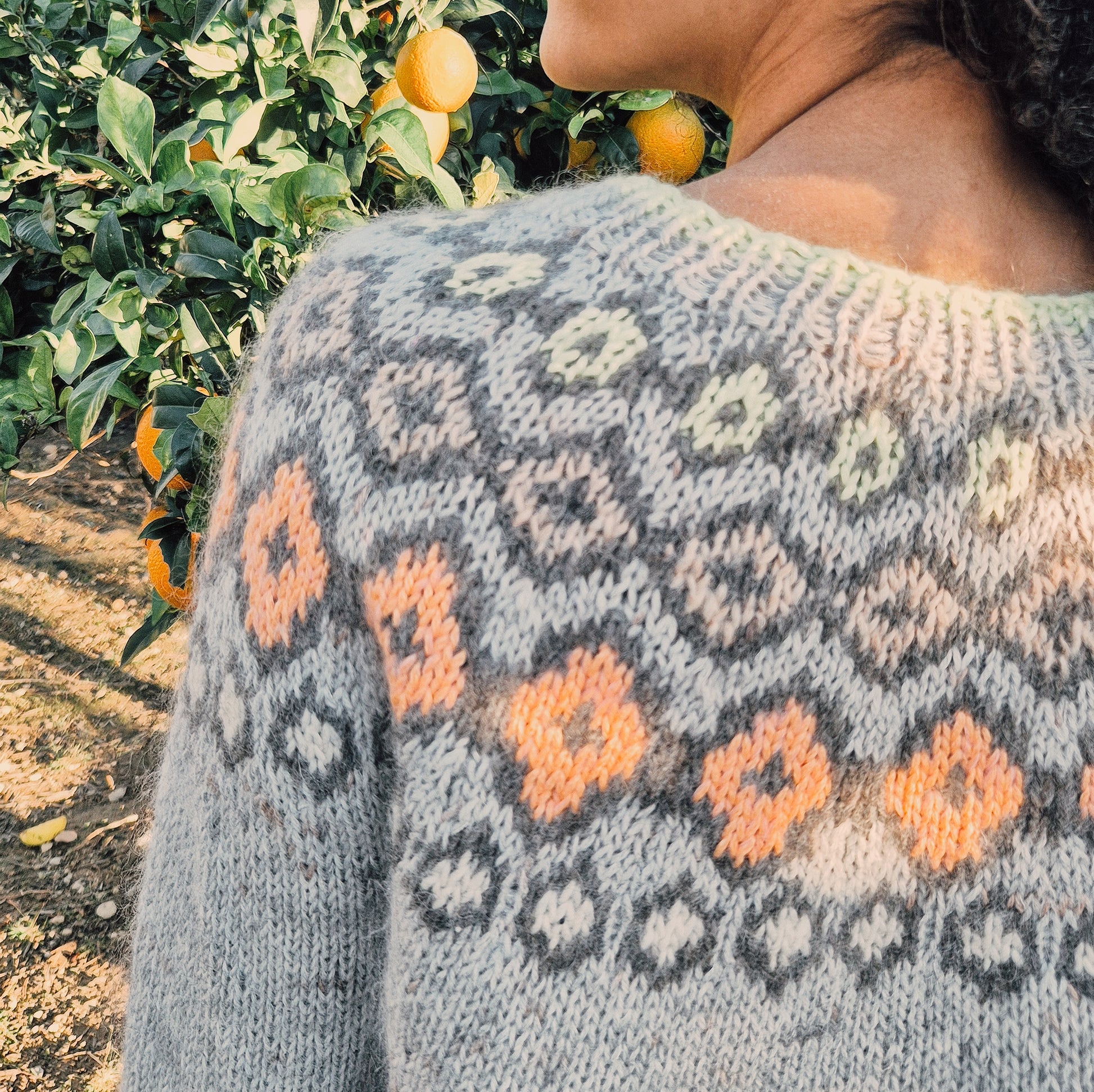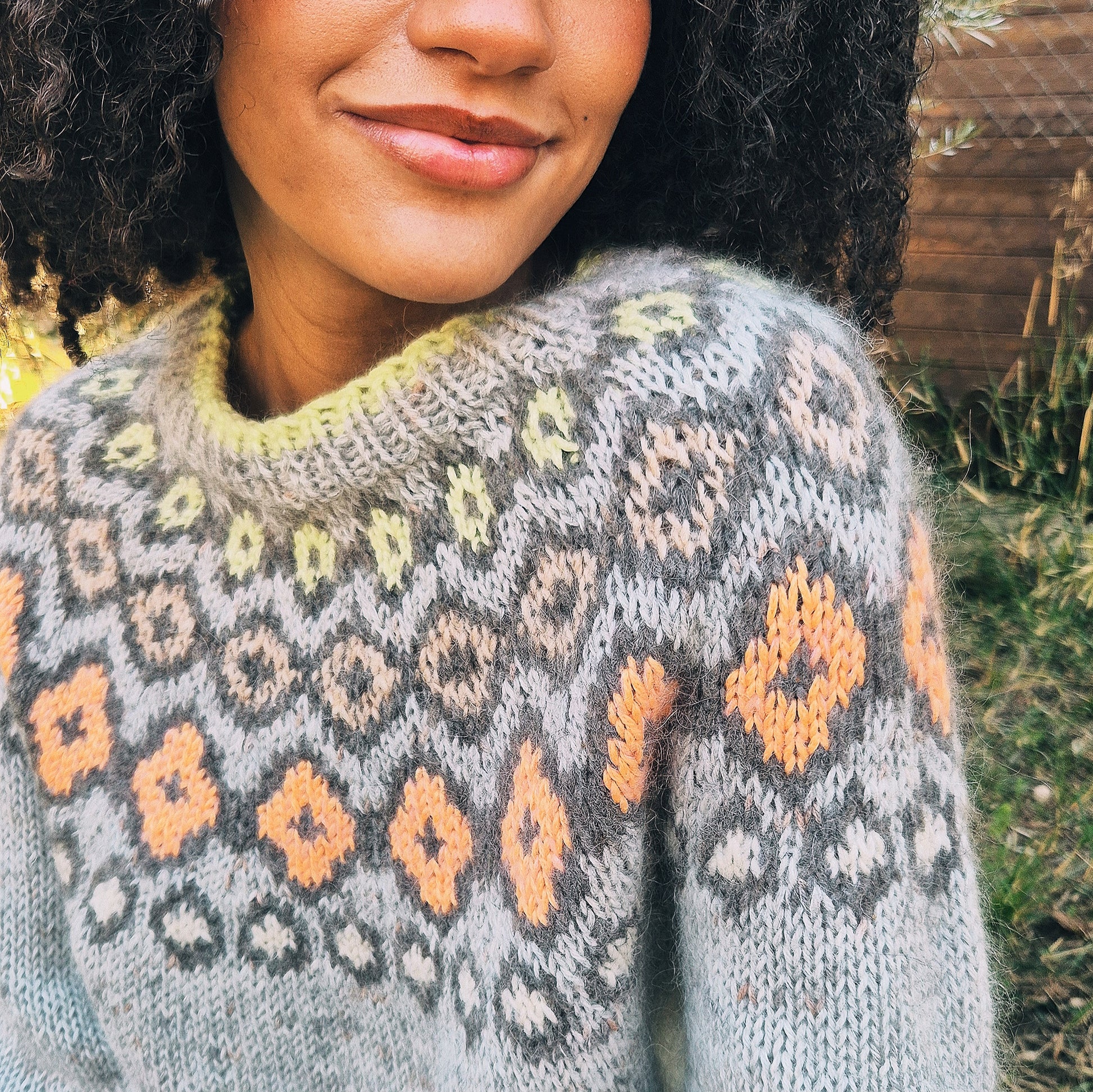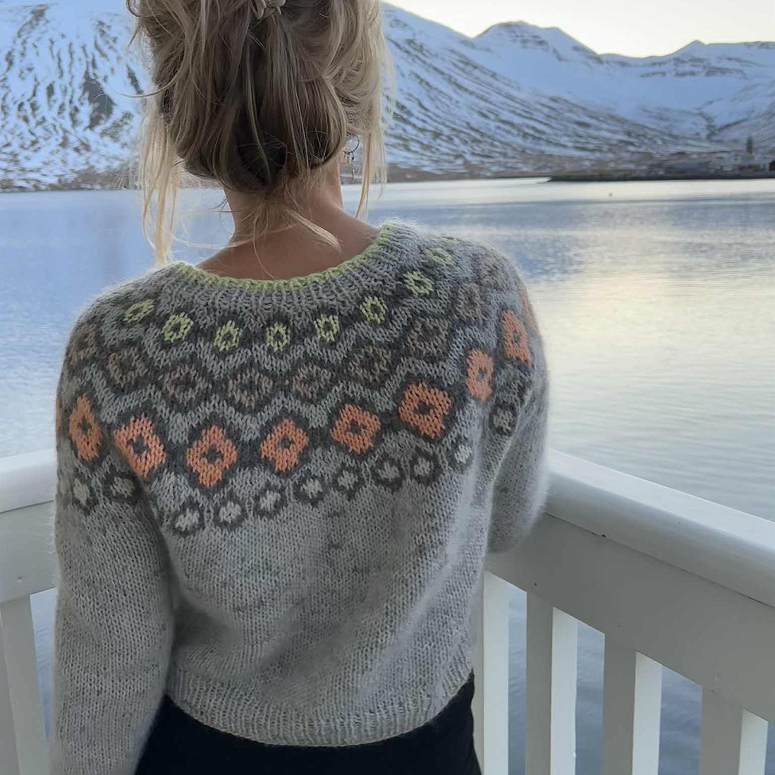 Irma ist ein leichter und farbenfroher Pullover, von oben nach unten mit eingestrickter Musterpasse gearbeitet.